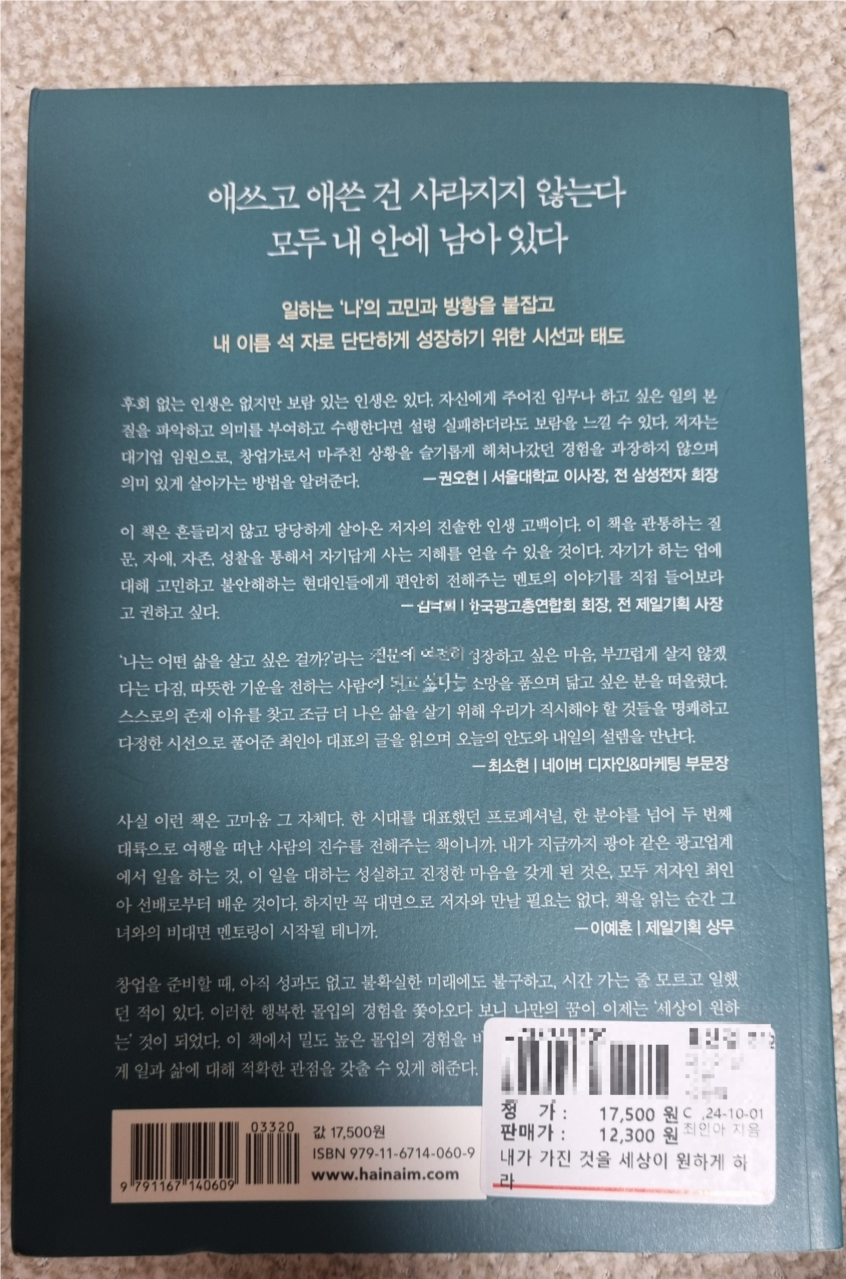 최인아의 『내가 가진 것을 세상이 원하게 하라』는 개인의 강점을 어떻게 발견하고, 그것을 세상에 필요한 가치로 바꿀 수 있는지를 이야기하는 책이다. 저자는 오랜 광고 기획자의 경험을 바탕으로, 브랜드가 시장에서 살아남는 원리를 개인의 성장과 연결시킨다. 단순한 자기 계발서가 아니라, ‘나만의 브랜드’를 만드는 전략을 제시하는 점이 인상적이었다.