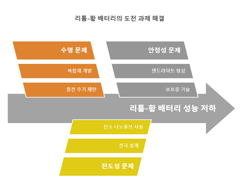- 기존 리튬-황 배터리는 300~500회 충·방전 후 성능 저하 문제