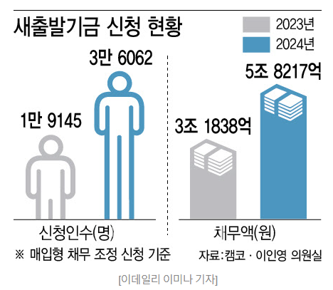한국자산관리공사(캠코)의 자료에 따르면, 지난해 새출발기금을 신청한 자영업자는 총 3만 6,062명으로, 전년 대비 약 1.9배 증가했습니다. 이는 2년 전과 비교하면 261% 늘어난 수치입니다. 채무액 또한 2023년 3조 1,838억 원에서 지난해 5조 8,217억 원으로 83% 증가했습니다.