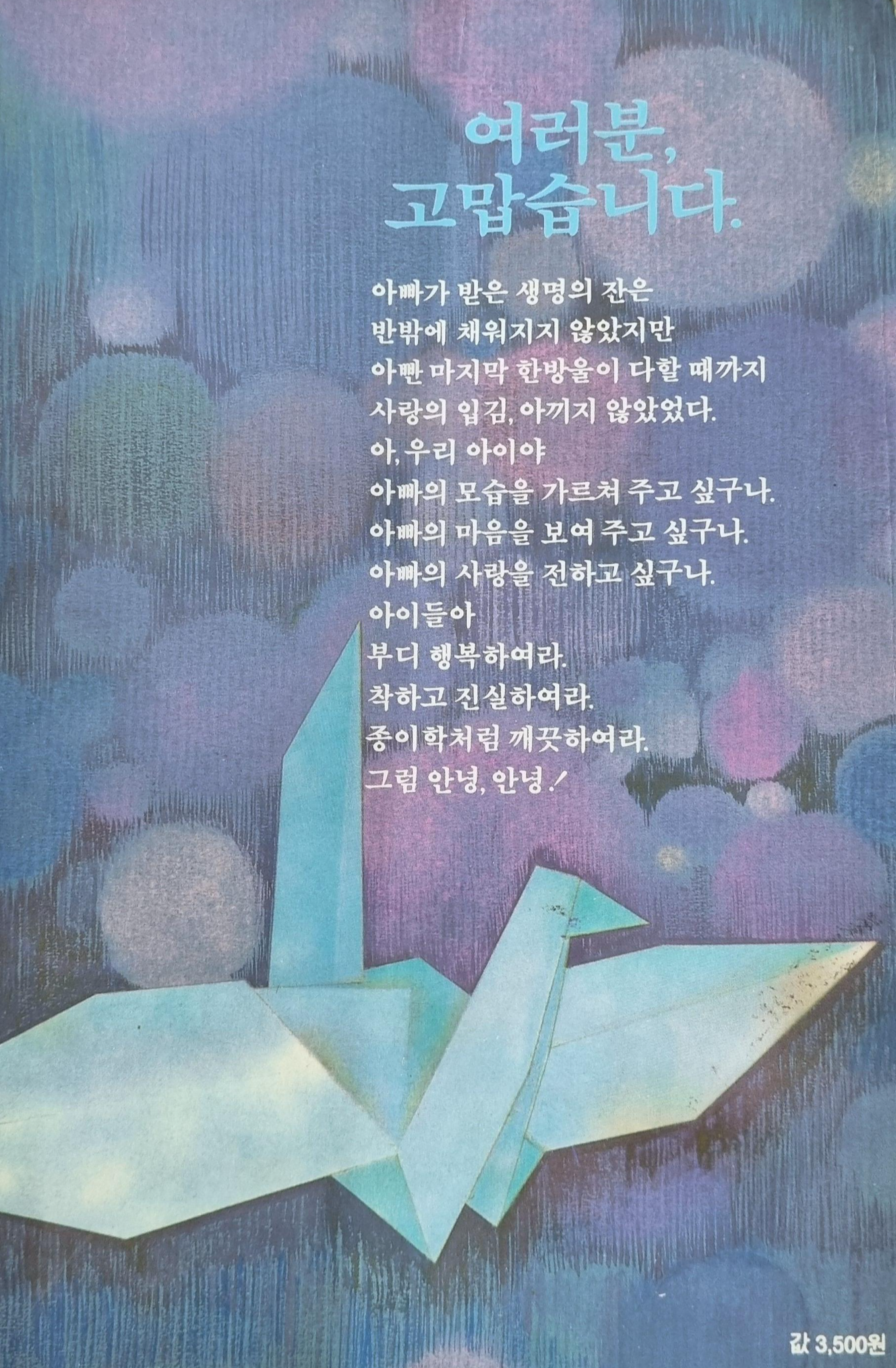 책을 읽으며 가장 마음을 울렸던 것은 저자가 가족을 얼마나 사랑했는지에 대한 이야기였다. 그는 두 아이와 아내에게 기억될 수 있도록 편지를 남기고, 직접 종이학을 접으며 자신의 마음을 담았다. 책 제목인 *"종이학"*도 여기서 유래했다. 특히, 아이들에게 남긴 메시지가 가슴을 먹먹하게 했다. 자신이 곁에 없더라도 용기 있게 살아가길 바란다는 그의 말은 단순한 유언이 아니라, 삶에 대한 애정과 희망을 담고 있었다. 이 부분을 읽으면서 자연스럽게 나도 가족을 떠올리게 되었다.