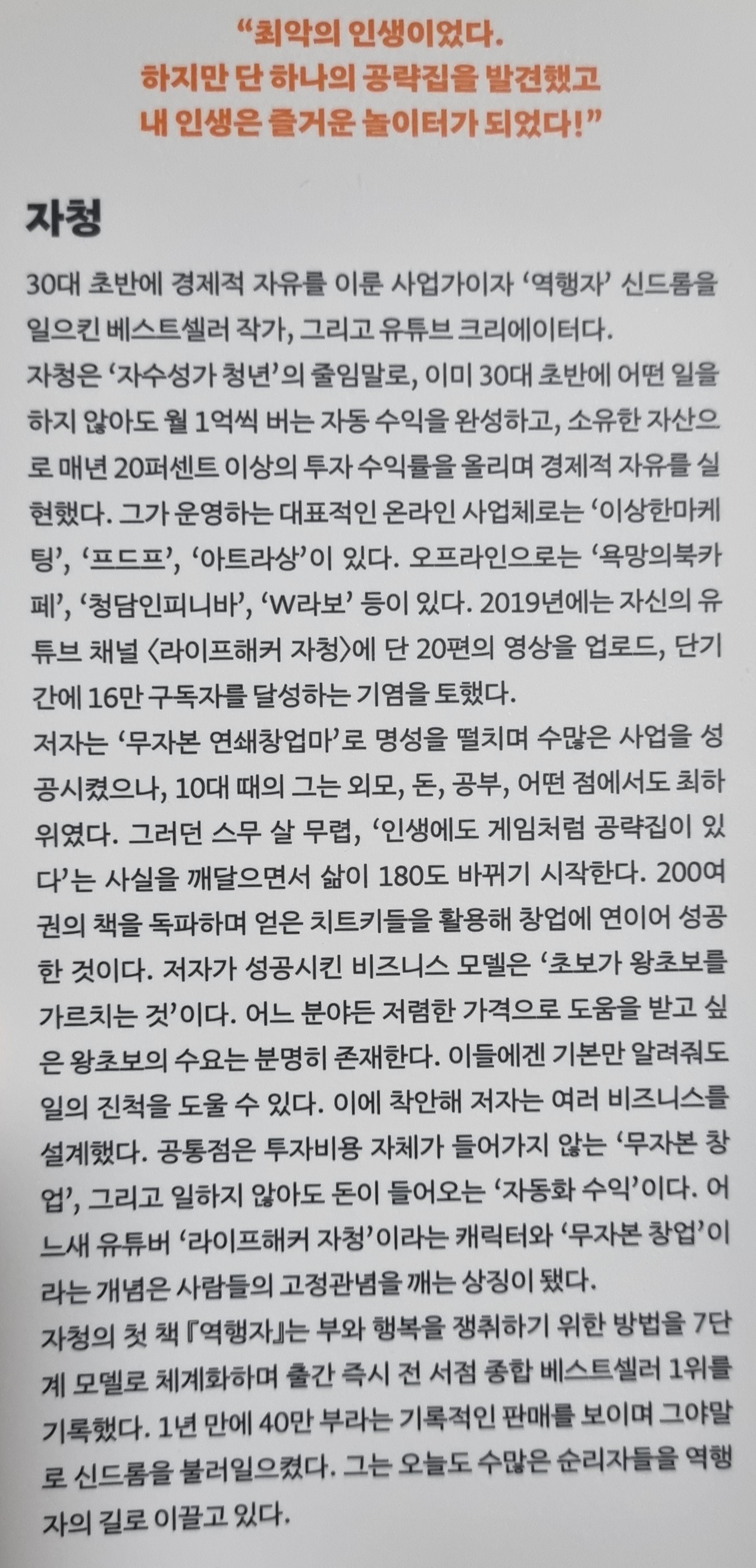 《역행자》는 자청이 쓴 자기 계발서로, 기존 사회에서 통용되는 성공 법칙과는 정반대의 사고방식을 제시하며 큰 화제를 모은 책입니다. 저자는 스스로를 ‘흙수저 출신의 사업가’라고 소개하며, 가난한 환경에서 벗어나 경제적·정신적으로 완전히 자유로운 삶을 살게 된 과정을 풀어냅니다. 그는 기존의 성공 공식을 따르는 대신, 정반대의 길을 걸으며 원하는 것을 이뤄냈다고 말합니다. 이 책은 그러한 경험을 바탕으로 누구나 ‘역행자’가 되어 원하는 삶을 살 수 있도록 안내하는 실용적인 방법을 제시합니다.