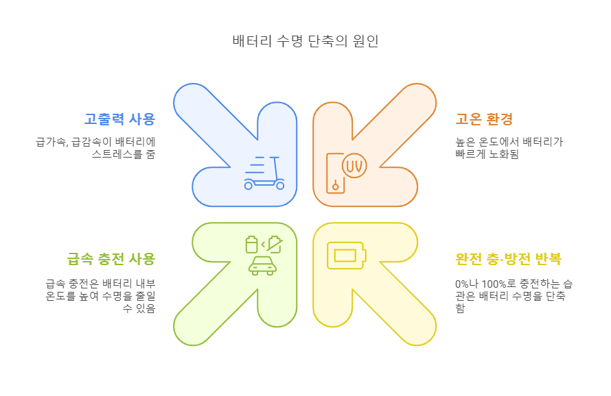 배터리는 충·방전 과정을 거치면서 서서히 성능이 저하됩니다. 주요 원인은 다음과 같습니다.